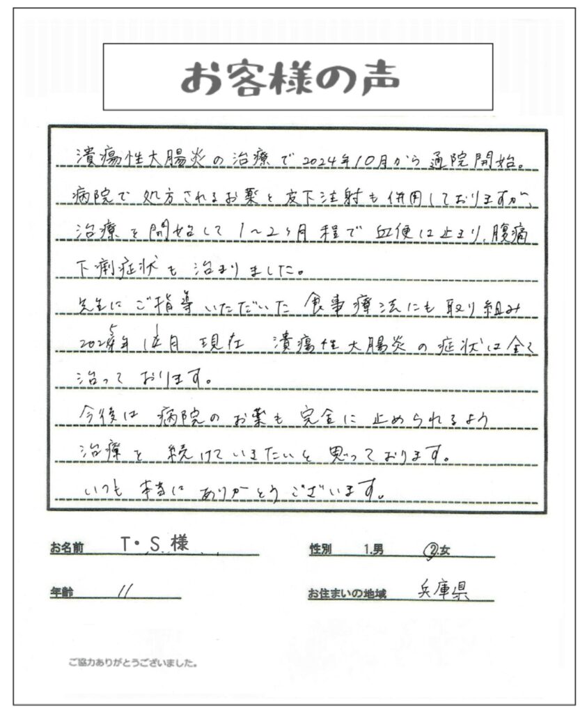 潰瘍性大腸炎の治療で2024年10月から通いはじめました。病院で処方される薬と皮下注射も併用していますが、鍼灸施術の開始から1~2ヶ月で血便が止まり、腹痛や下痢も改善しました。