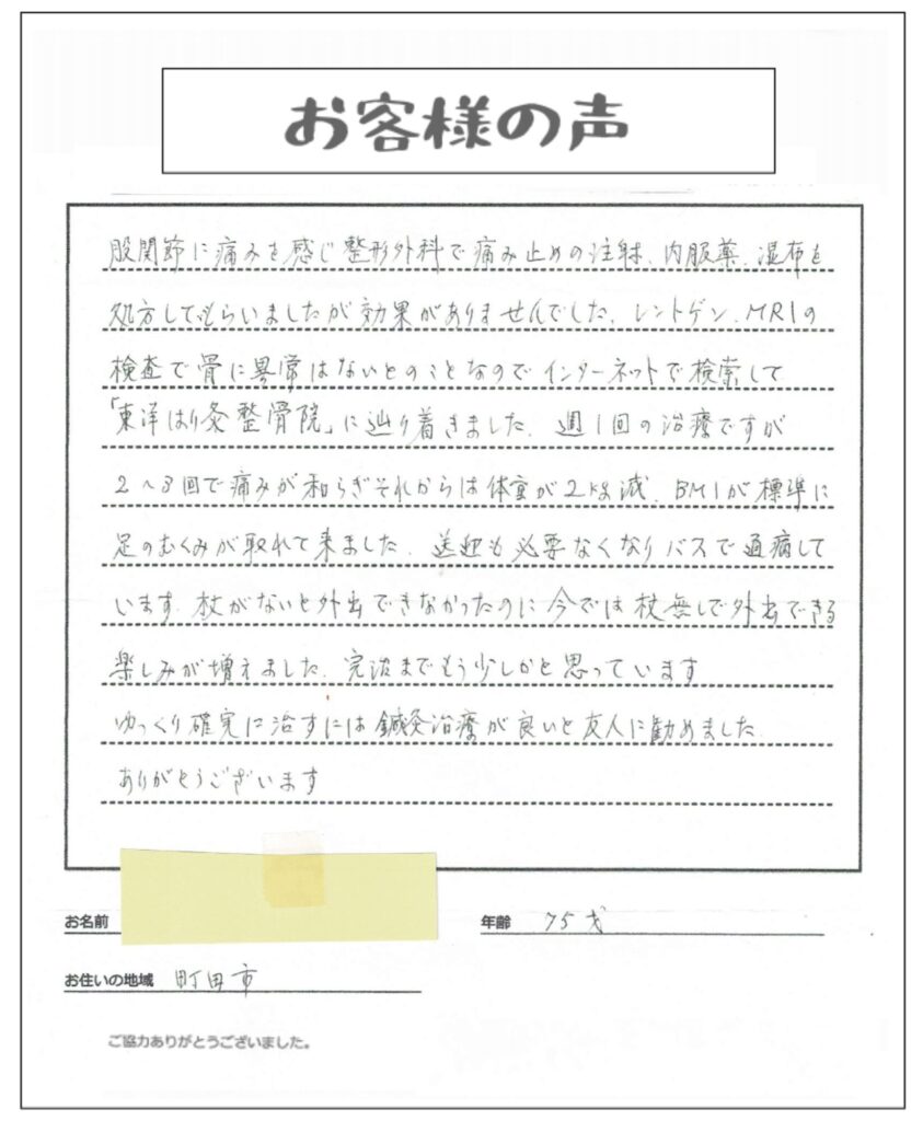 股関節の痛みで整形外科に通い、注射・内服薬・湿布を処方されましたが改善しませんでした。レントゲンやMRIでも異常が見つからず、ネット検索で「東洋はり灸整骨院」を知り、通うことにしました。
